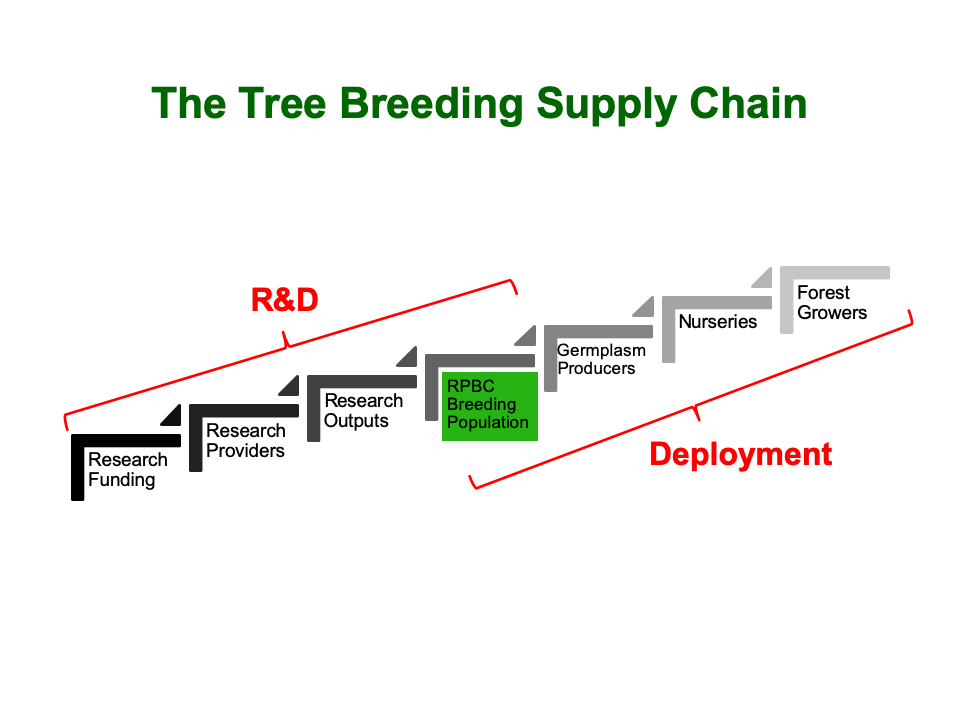 The second component is Deployment which, starting with the RPBC breeding population retaining the very best of the material put to test, is then channeled to market via Germplasm Producers, Germplasm Producers, Nurseries, and finally to Forest Owners