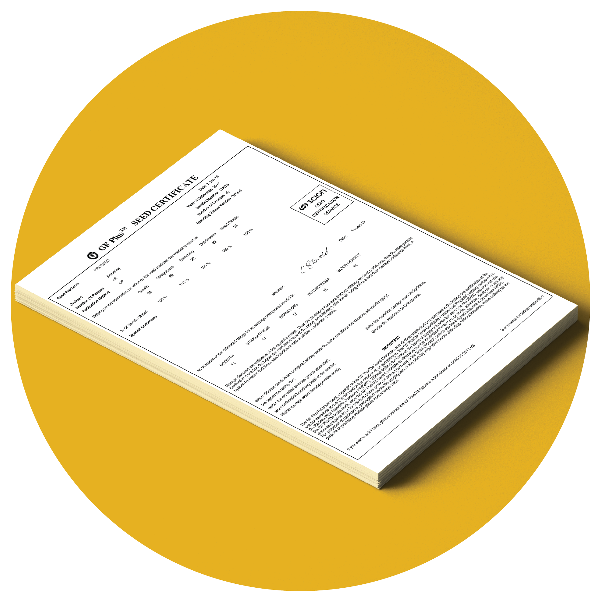 Seed certificates show GF Plus™ values for each trait in each seedlot purchased from seed orchards and nurseries. Certificates are provided to seed orchard managers by the Seed Certification Service and to a nursery on purchase of seed. All purchasers of planting stock from radiata nurseries are entitled to receive a seed certificate certifying its genetic link.